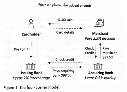 From money laundering to cryptocurrencies, this book has also sparked introspection as I reflect on my digital footprint with my handy Bank of America credit card. With the advent of the first credit card in Major’s Cabin Grill in New York in 1950, credit cards and the four corners business model have become one of the driving technologies pioneering growth in the modern era. The graph is drawn from the book and the author explains it as follows: